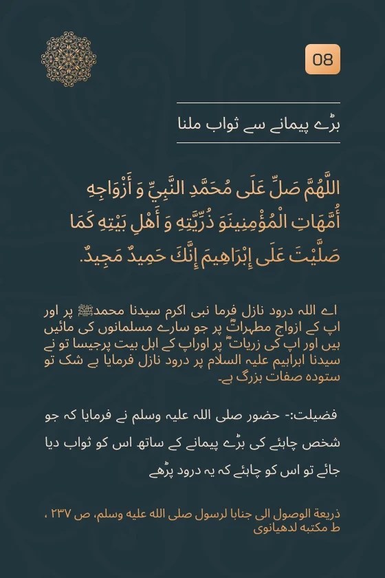 رسول اللہ صلی اللہ علیہ وسلم نے فرمایا: “جو شخص چاہے کہ اس کو بڑے پیمانے پر ثواب ملے، وہ یہ درود شریف پڑھے۔”